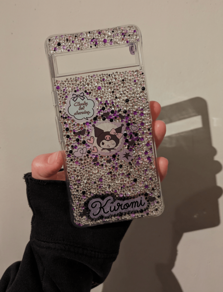 On a bit of a whim, I purchased a small bedazzling kit on Amazon. After about a week of visualizing ideas, I finally settled on blinging out a clear phone case that I had purchased the month prior. I gathered together some stickers featuring Kuromi, a punk-rock rabbit-esque Sanrio character, and went to work. After two days of bent-kneck hyperfixation, I sealed and dried out this beautiful bedazzled creation that I wish to share with you, dear reader.